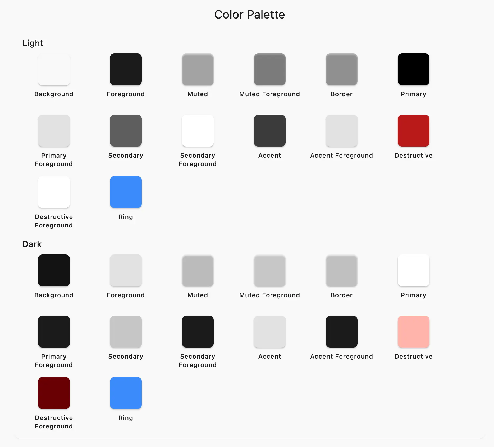 Once you have an established color palette, you can create a class that combines all the palette colors in it. Let's add the key colors from Shadcn to it: