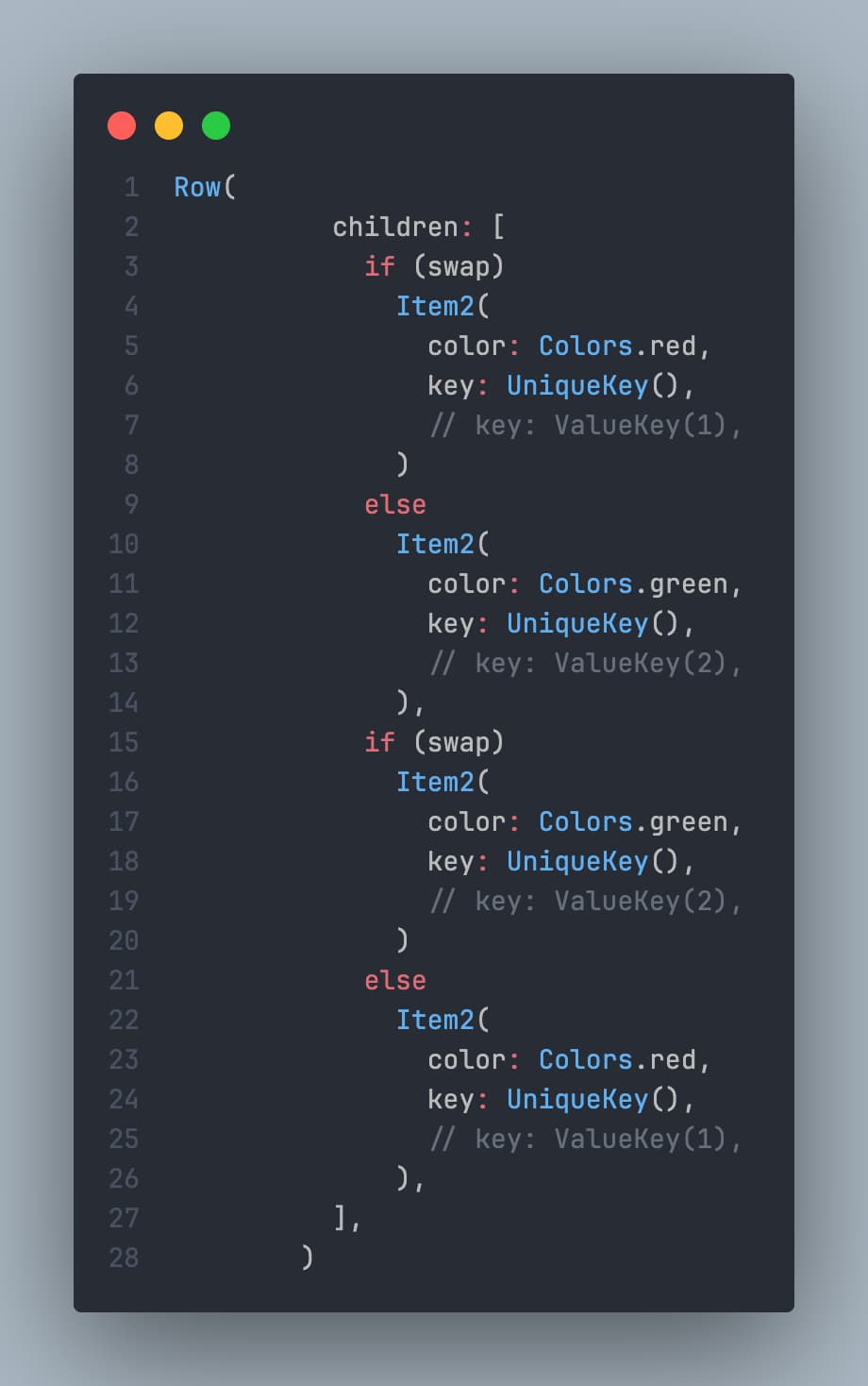 New instances of widgets are created during the build process, but attached elements remain the same. Thus, there is a need to find a way of matching the old and new generation. Flutter has a straightforward static method on Widget that compares new and old elements. If the runtime type and keys are alike, the element could be updated with the new configuration. When there is no key, only types are compared, which can sometimes result in unpredictable behaviour.