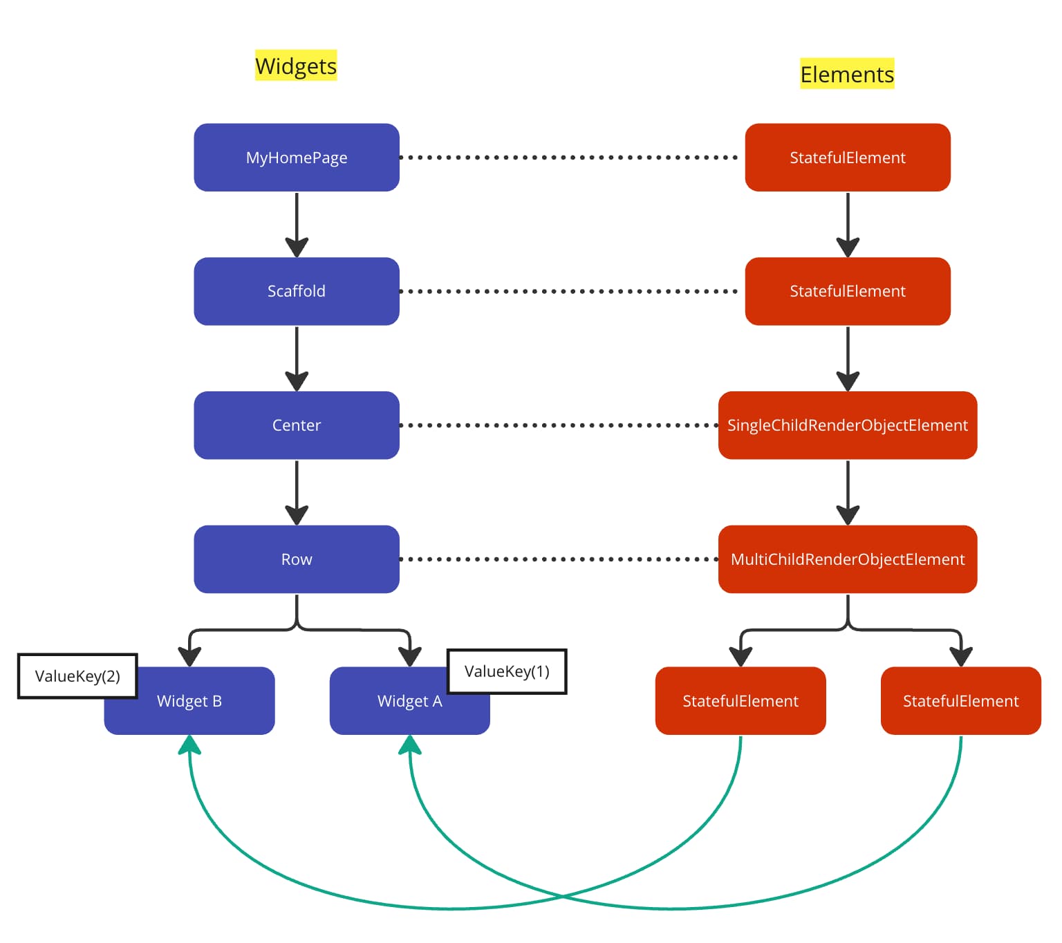 This is because [State] lives inside an [Element]. It's not attached to the widget in any way. Obviously, the problem above is caused by new widgets being linked to the wrong elements. If you want to know more about an algorithm for updating elements, see the documentation notes at https://github.com/flutter/flutter/blob/stable/packages/flutter/lib/src/widgets/framework.dart#L3773 and https://github.com/flutter/flutter/blob/stable/packages/flutter/lib/src/widgets/framework.dart#L3786-L3815.
