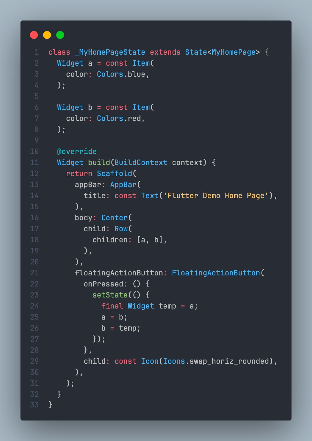 Please note that widget 'a' and widget 'b' are independent instances of the same class that lack the key. Upon calling the setState method, a new build is activated, composing new widgets in different 'slots' (also called locations). However, let's examine [Widget.canUpdate].