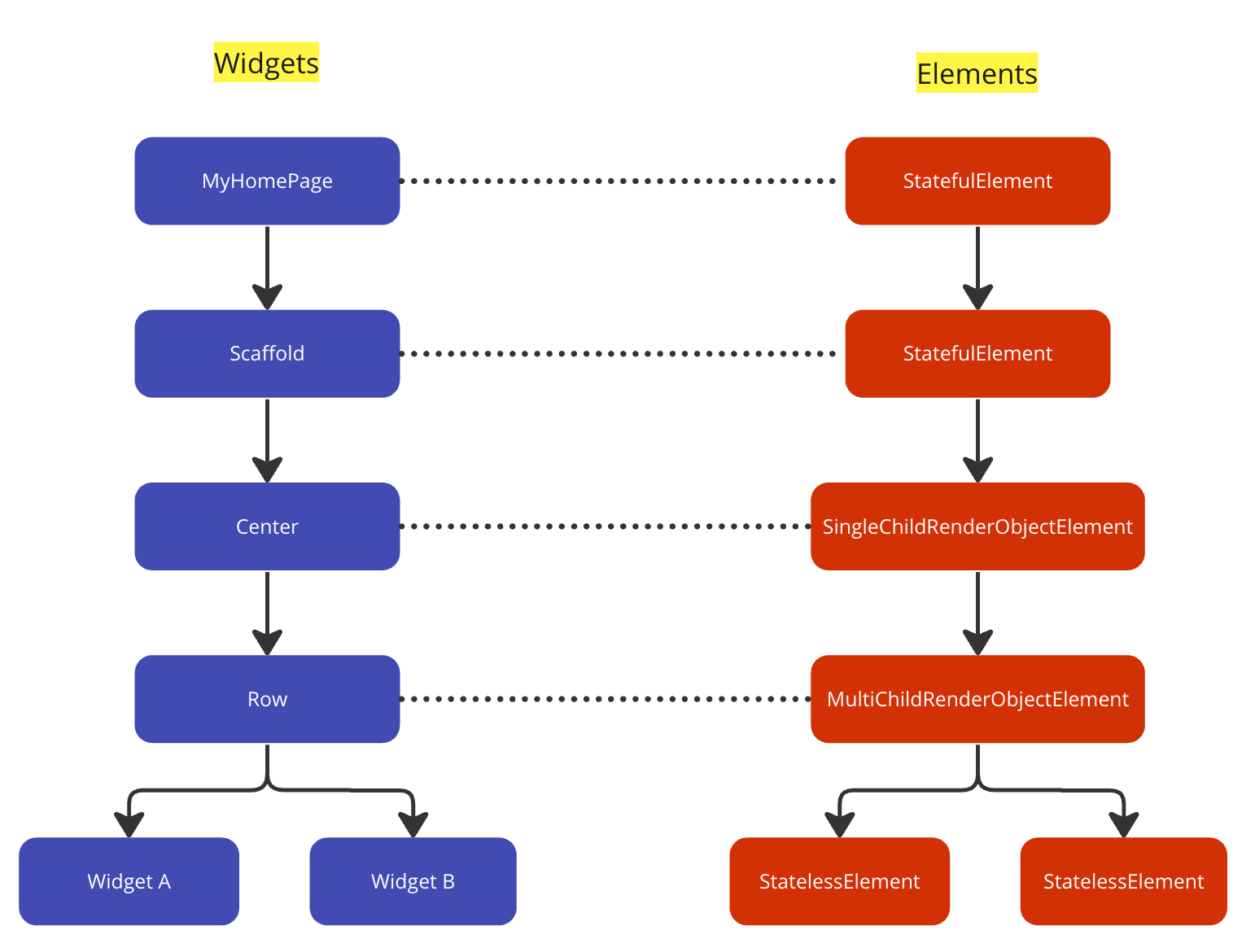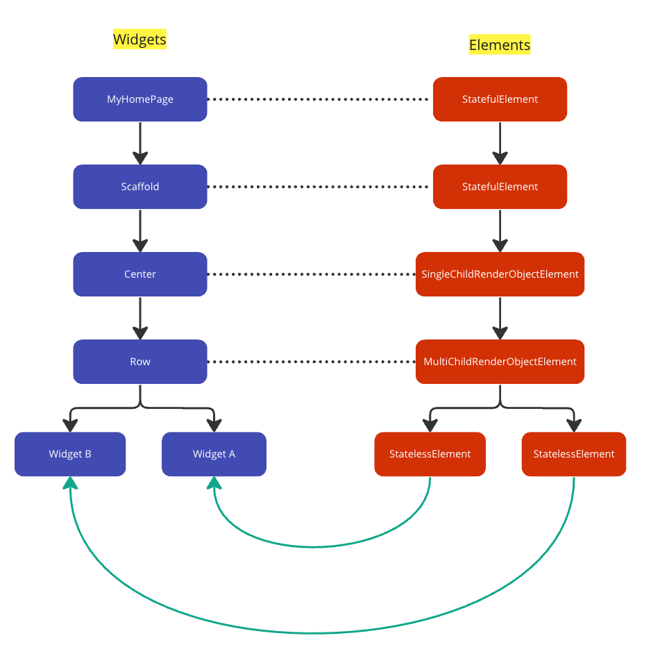 When the framework inflates the widget, it creates the corresponding element. In our scenario, the structure will appear like this, keeping in mind that it was simplified.
